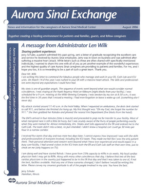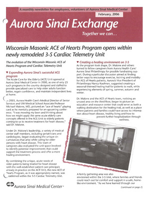 Aurora Sinai Medical Center, Milwaukee, WI: Internal employee newsletter with workplace anniversaries, news, and events. The Care Management article is on heart failure.
