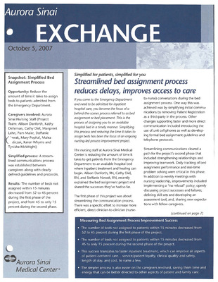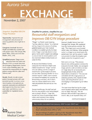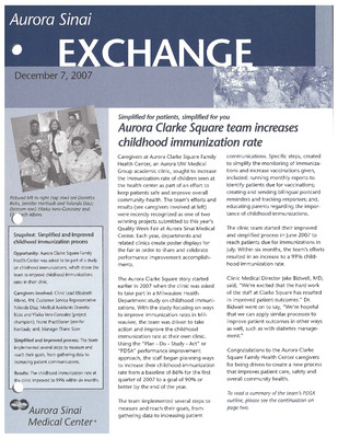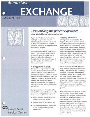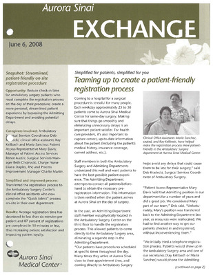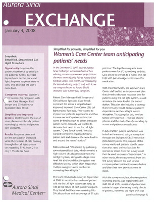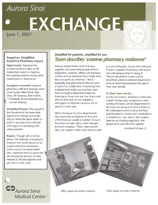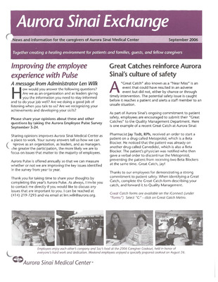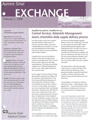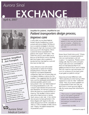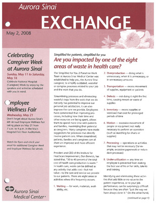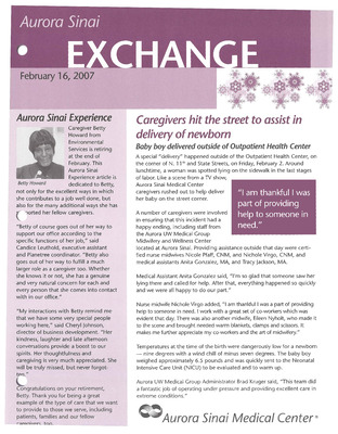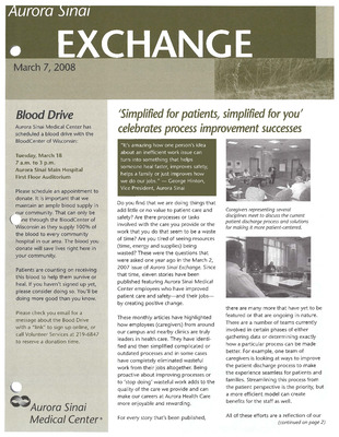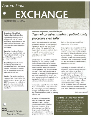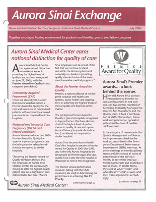 Aurora Sinai Medical Center, Milwaukee, WI: Internal employee newsletter with workplace anniversaries, news, and events. The Care Management article is on patient safety.