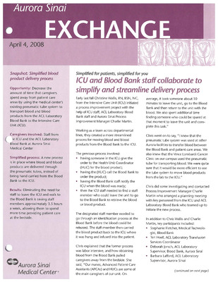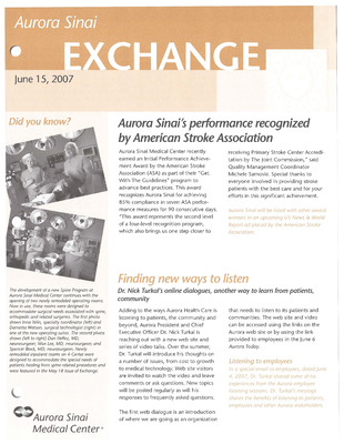 Aurora Sinai Medical Center, Milwaukee, WI: Internal employee newsletter with workplace anniversaries, news, and events. Feature article is on eICU, a remote critical care monitoring system.