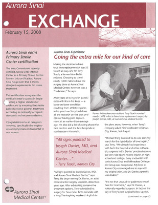 Aurora Sinai Medical Center, Milwaukee, WI: Internal employee newsletter with workplace anniversaries, news, and events. The Care Management article is on total joint replacement care.