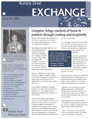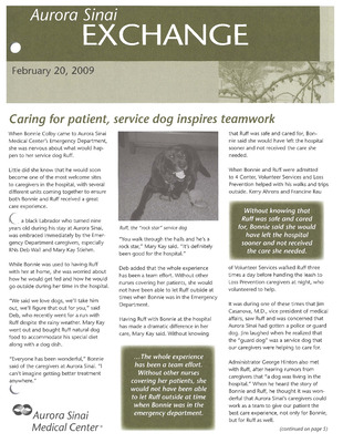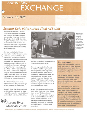 Aurora Sinai Medical Center, Milwaukee, WI: Internal employee newsletter with workplace anniversaries, news, and events. The Care Management article is on preventing bed sores.