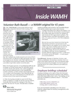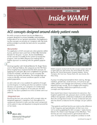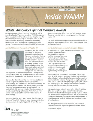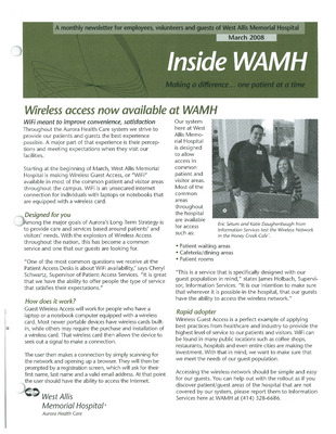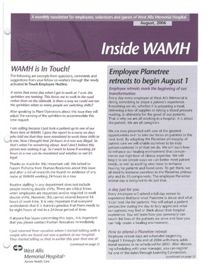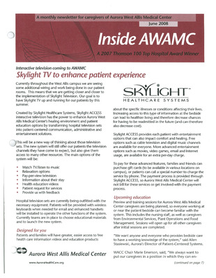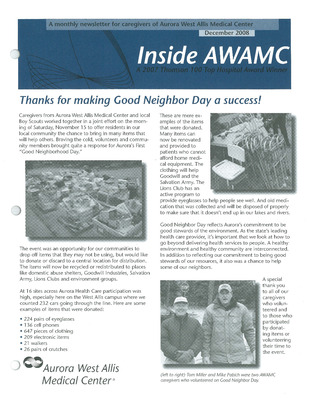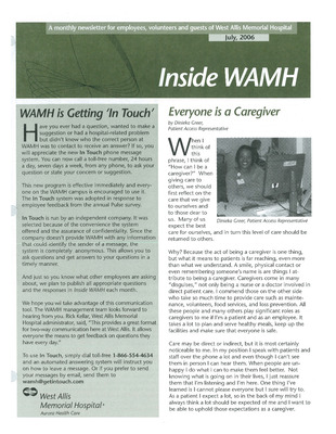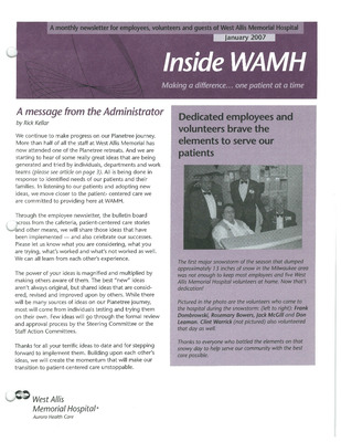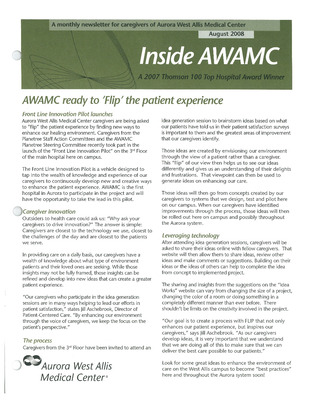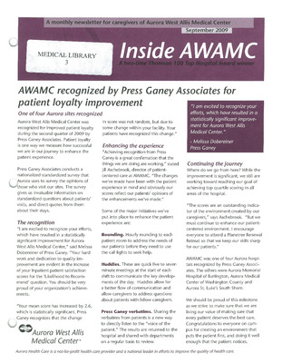 Aurora West Allis Medical Center, West Allis, WI: Inside AWAMC is a monthly newsletter for employees, volunteers, and guests of the hospital. This issue has a feature on improving patient experiences.