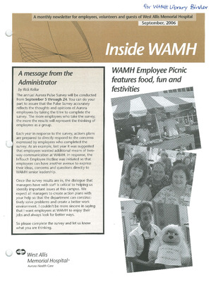 Aurora West Allis Medical Center, West Allis, WI: Inside AWAMC is a monthly newsletter for employees, volunteers, and guests of the hospital. This issue includes announcements of programs and services.