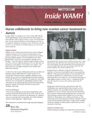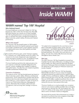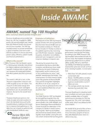 Aurora West Allis Medical Center, West Allis, WI: Inside AWAMC is a monthly newsletter for employees, volunteers, and guests of the hospital. This issue announces that the hospital was named a top 100 hospital nationally by Thomson Healthcare.