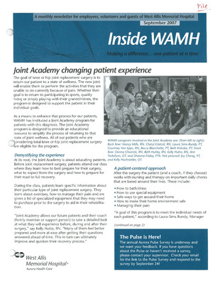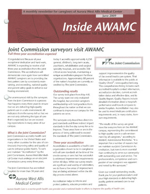 Aurora West Allis Medical Center, West Allis, WI: Inside AWAMC is a monthly newsletter for employees, volunteers, and guests of the hospital. This issue announces the hospital expects a full three-year accreditation from the Joint Commission.