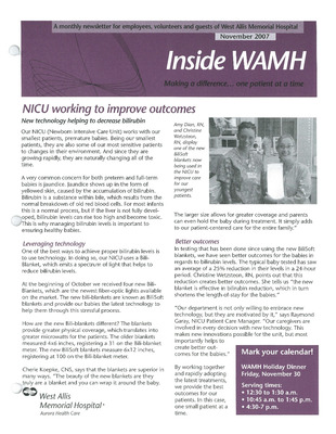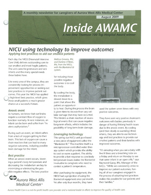 Aurora West Allis Medical Center, West Allis, WI: Inside AWAMC is a monthly newsletter for employees, volunteers, and guests of the hospital. This issue has a feature on new technology in the NICU.