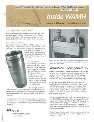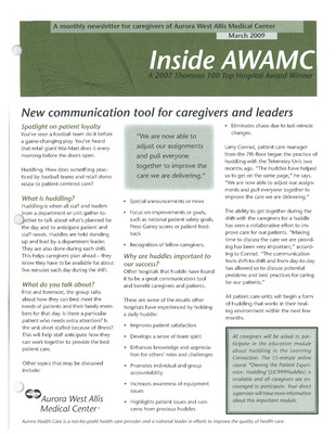 Aurora West Allis Medical Center, West Allis, WI: Inside AWAMC is a monthly newsletter for employees, volunteers, and guests of the hospital. This issue has information about the hospital's new 'green' initiatives and introduces 'huddles' as a a new communication tool for teams.