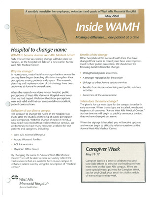 Aurora West Allis Medical Center, West Allis, WI: Inside AWAMC is a monthly newsletter for employees, volunteers, and guests of the hospital. This issue announces that Aurora Health Care was named a top performing health system nationally by Centers for Medicare & Medicaid Services.