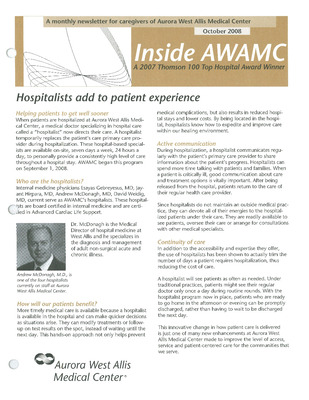 Aurora West Allis Medical Center, West Allis, WI: Inside AWAMC is a monthly newsletter for employees, volunteers, and guests of the hospital. This issue has a feature on the work of hospitalists.