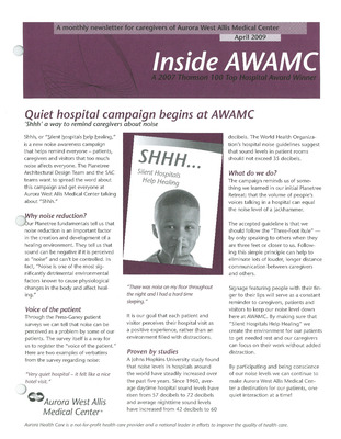 Aurora West Allis Medical Center, West Allis, WI: Inside AWAMC is a monthly newsletter for employees, volunteers, and guests of the hospital. This issue has a feature on the hospital's SHHH campaign to promote noise reduction in patient areas.