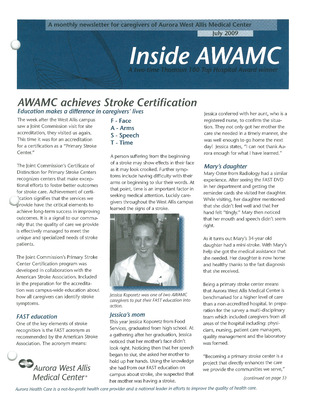 Aurora West Allis Medical Center, West Allis, WI: Inside AWAMC is a monthly newsletter for employees, volunteers, and guests of the hospital. This issue has a feature on FAST Stroke education.
