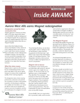 Aurora West Allis Medical Center, West Allis, WI: Inside AWAMC is a monthly newsletter for employees, volunteers, and guests of the hospital. This issue announces the hospital's Magnet designation.