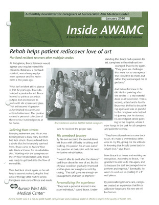 Aurora West Allis Medical Center, West Allis, WI: Inside AWAMC is a monthly newsletter for employees, volunteers, and guests of the hospital. This issue has a feature store on a stroke rehabilitation patient.